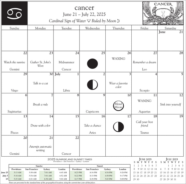 The Witches’ Almanac 2025 Wall Calendar is a practical guide designed to help you harness the power of lunar phases and zodiacal influences to enhance both your magical and everyday life. In addition to featuring Moon phases, zodiacal tracking, and suggested actions for each month, this year's edition is enriched with the theme of ancient symbols. These timeless symbols provide deeper layers of meaning, guiding you to optimize your magical practices and daily routines. With expanded insights into monthly themes from The Witches Almanac, this calendar offers a profound journey for those seeking spiritual growth and connection to the ancient wisdom of the past.